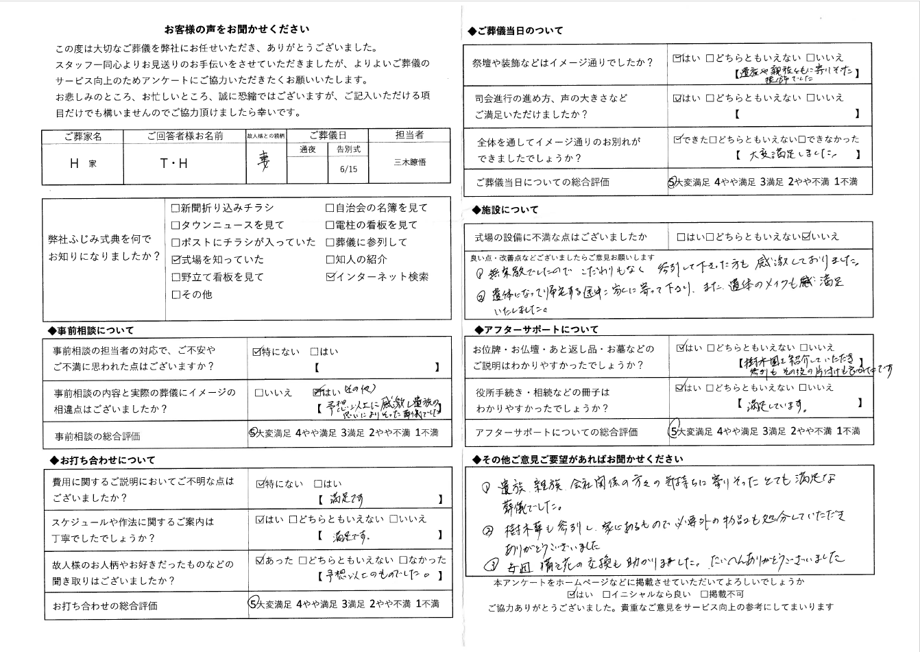 たくさんご記入いただきお言葉を聞かせていただきありがとうございます。無宗教は皆様のお気持ちでお送りする時間がたくさんありますので、皆様語り合えたでしょうか?故人様を偲ぶ大切なお時間をわたくしたちにお任せいただき、あらためて感謝いたします。何かと至らない点、多々あったかと思いますがこのようなアンケートのお答えをいただき、ありがとうございます。またお近くの樹木葬をご紹介させていただきご購入いただきましてありがとうございました。この先もずっとご不明な事お困りごとがございましたらいつでもお声をおかけください。
