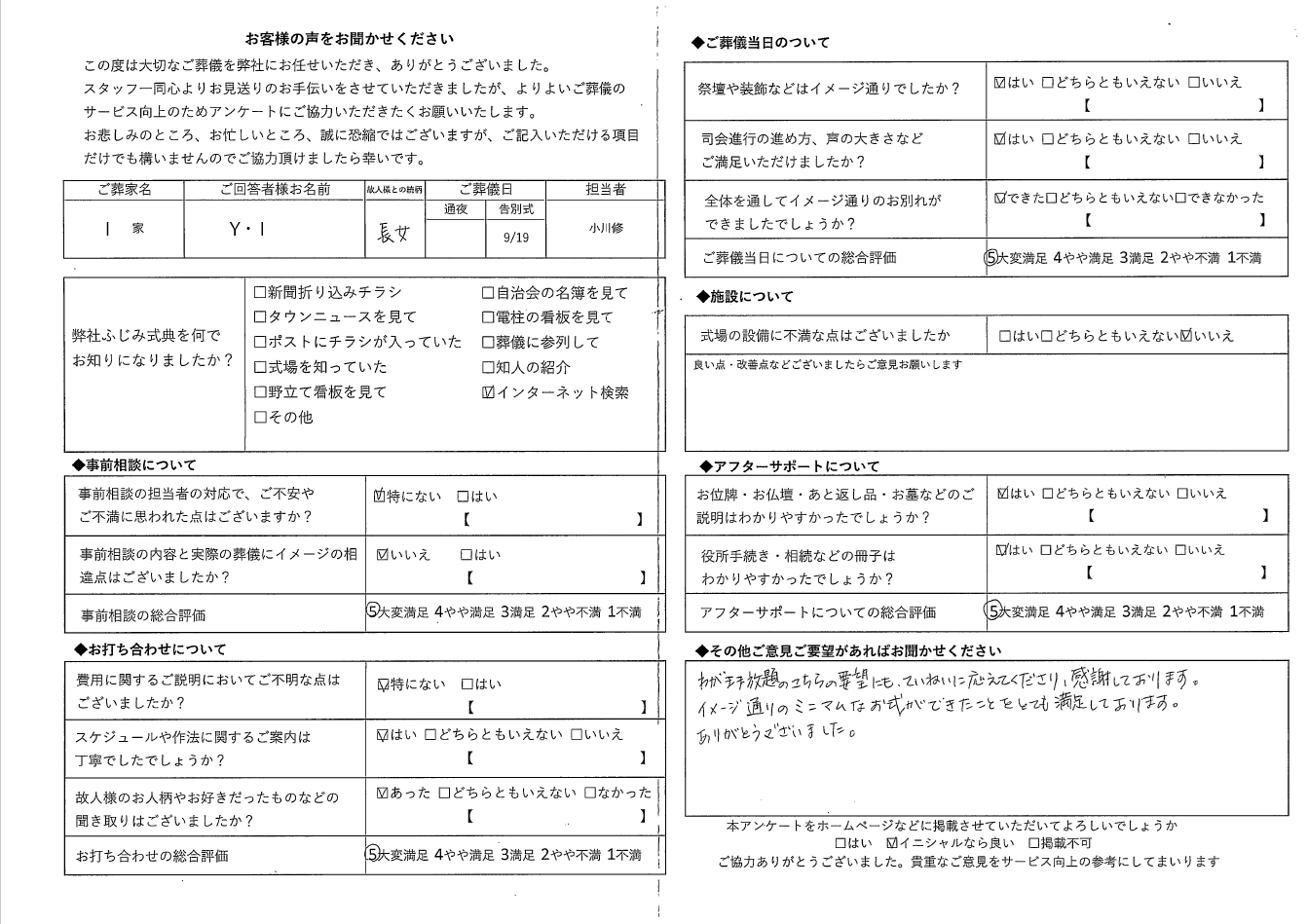 たくさんご要望を伝えていただきありがとうございます。ご家族様のお気持ちが解りますと私どもの提案と合わせることができます。よい時間をお過ごしいただけて何よりです。この先もずっとご不明な事お困りごとがございましたらいつでもお声をおかけください。