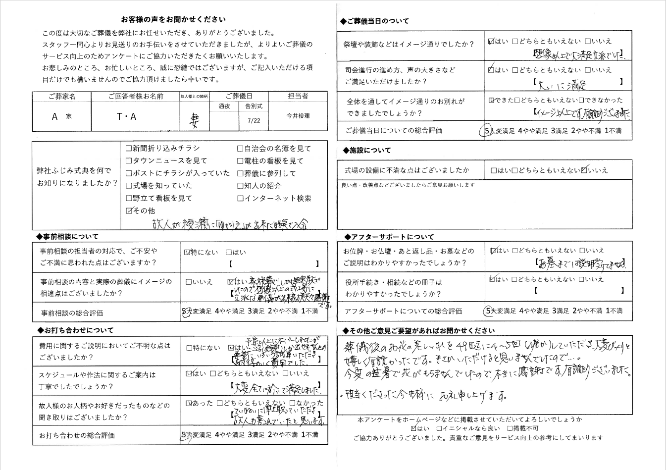 葬儀後のお花の差し入れを49日に4~5回(確か)していただき、大変びっくりと嬉しく有難かったです。まさかいただけるとは思いませんでしたので。今夏の猛暑で花がもちませんでしたので本当に感謝です。有難うございました。担当してくださった今井様にお礼申し上げます。打合せ:大変満足 家族葬で無宗教だったので想像以上の式場に立派な葬儀が出来、家族共々感謝です。予算以上にオーバーしましたがここまでしか出せませんのでとの要望にいろいろ試算いらだき、納得のいく費用でした。故人の人柄などていねいに聞き取っていただき故人も喜んでいたと思います。ご葬儀当日:大変満足 祭壇装飾想像以上に大変立派でした。司会進行など大いに満足です。全体を通してイメージ以上です。有難うございました。アフターサポート:大変満足