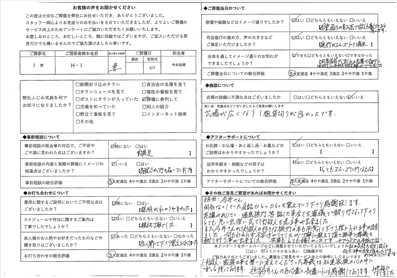 担当今井さん。何気なくしていた会話ひとつひとつ覚えていて下さり感謝致します。花壇のあじさい、温泉旅行等話した事全てを葬儀で執り行って下さりとても思い出深い式で故人を送る事が出来ました。また今井さんが故人の好きな旅行の本も用意してくださり棺に入れることができました。何もわからず不安ばかりでしたが丁寧に教えていただき無事に葬儀を執り行うことができました。写真もうれしかったです。サプライズの手紙では私の気持ちを夫に伝えることができて良かったです。ありがとうございました。故人のこと、家族のことを第一に考えてくださった葬儀は私達家族の中にずっと残っております。担当の今井さんのお心遣い、気遣いには感謝しております。お世話になりました。事前相談:大変満足、気配りが行き届いていました。 打合せ:大変満足 説明がわかりやすく親切丁寧でした ご葬儀当日:大変満足 希望通りの青の花で故人も喜んでいると思います。司会進行 スムーズにて満足 同席者が別れの言葉を告げ故人に気持ちを伝える事ができました アフターサポート:大変満足 とてもスムーズに行えた
